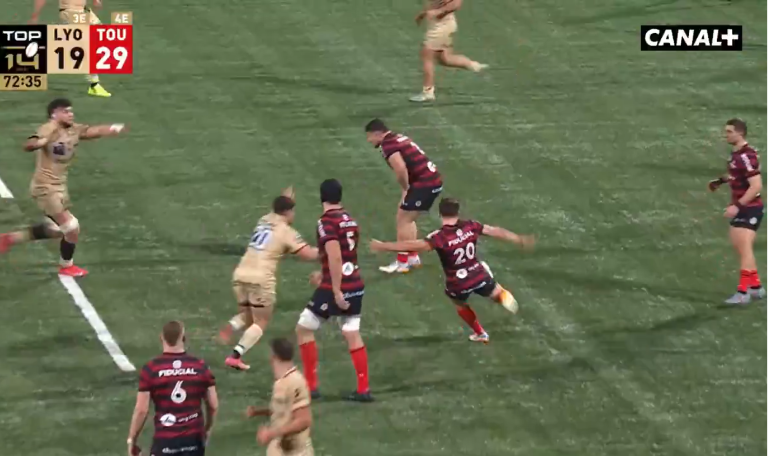 Mais les Toulousains répondent coup pour coup cette fois, et aplatissent deux essais à leur tour (29-19). Puis à quelques minutes du terme, Antoine Dupont voit ce que personne d’autre n’a vu. Avec un seul jeu au pied, le demi de mêlée bouleverse le court de l’action, et sert Célian Pouzelgues sur son aile. Ce dernier attend du soutien, et n’a plus qu’à passer son ballon à Paul Costes pour l’essai. Mais vous l’aurez bien compris, tout est parti en vrille dans cette action à cause du génie odieux d’Antoine Dupont.