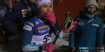 Seule Franziska Preuss semble en mesure de lui carotter la première place. L’Allemande repart du pas de tir avec un matelas maigrichon de 4,6 secondes, mais au fil des mètres, son avance fond comme neige au soleil, et termine derrière Braisaz-Bouchet pour 1,4 seconde. Nous sommes anéantis.