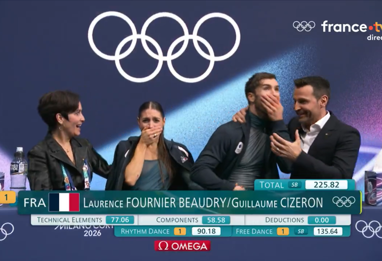 Ces derniers précèdent Cizeron et Fournier Beaudry, et claquent un score vertigineux (224.39). On fait comme si on pige quelque chose aux scores, on espère que cela passe crème. Puis vient le tour de Guillaume Cizeron et Laurence Fournier Beaudry sur la glace italienne. Après quelques minutes suspendues dans le temps, ils doivent patienter pour connaître leur résultat final pendant aussi longtemps.