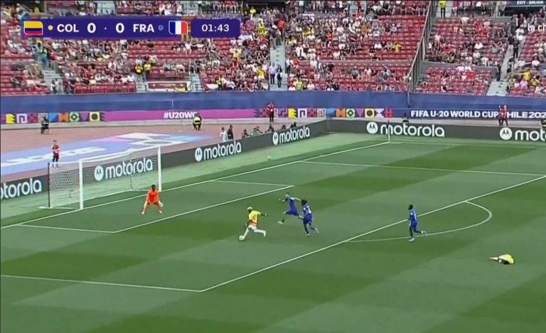 En effet, à la suite d’une perte de balle idéalement placée – à 30 mètres des cages dans l’axe -, l’équipe de France offre la possibilité aux Colombiens de se procurer une première occasion de but. Oscar Perea ne se fait pas prier, et fait trembler les filets tricolores au bout de 90 secondes seulement. On est clairement sur une entame de match de rêve.