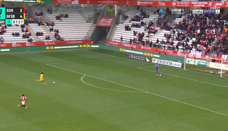 Grâce à cette inspiration de génie, Evans Maurin file au but, avec strictement aucun défenseur à ses trousses. L’attaquant français fixe le gardien, commence à enchaîner des passements de jambes avant de passer le ballon derrière sa jambe, espérant feinter le retour d’un défenseur. C’est finalement une cata sur tous les plans, et Maurin peut tranquillement repartir vers l’arrière. Bienvenue en Ligue 2.