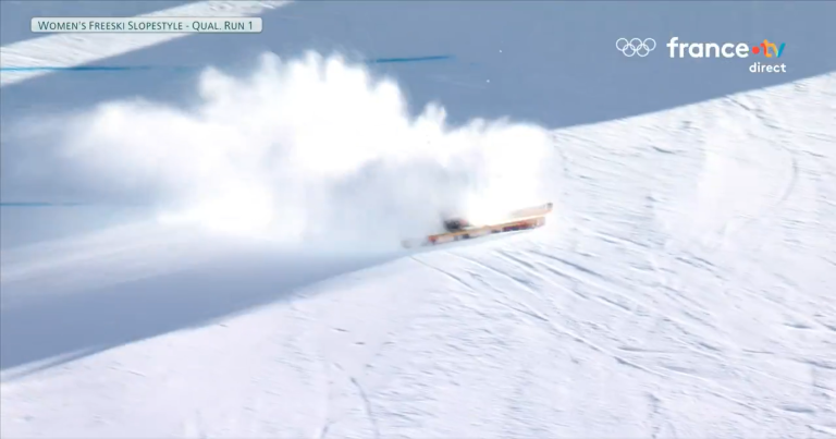 Oui mais voilà, en slopestyle, les athlètes ont droit à deux runs. Kim Dumont-Zanella s’élance et produit du ski acrobatique de qualité. Mais vers la fin de sa performance, la Française termine sur les fesses à l’issue d’un saut dans le ciel de Livigno. Deux runs, deux chutes. On aime cette énergie.