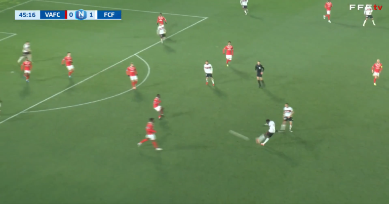 Sur la première action du coup d’envoi de la seconde période, le ballon revient sur Morgan Jean-Pierre à la suite d’un centre mal dégagé par la défense valenciennoise. Mais ne comptez pas sur le joueur du Fleury FC pour faire tourner le ballon à la manière du tiki-taka. Ce dernier envoie une praline de 30 mètres dans la lucarne de Jean Louchet, qui se demande encore ce qu’il vient de se passer.