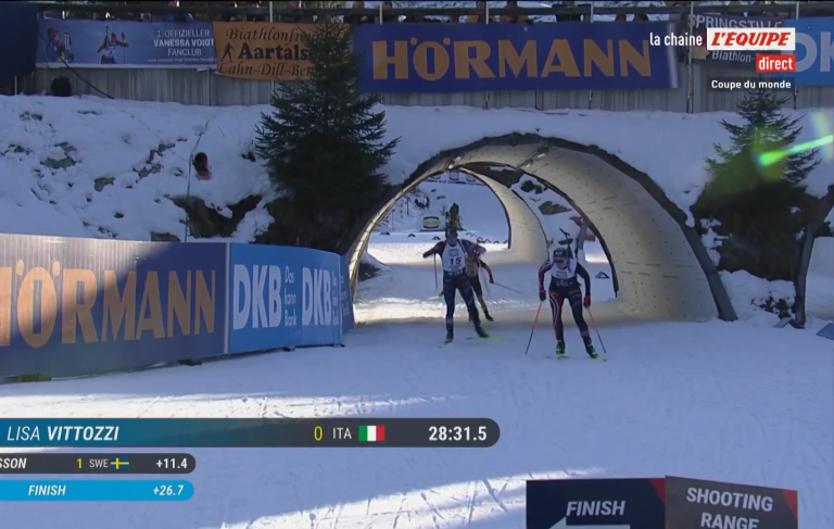 Si la jeune Française croit au podium, elle est rapidement rattrapée par Elvira Oeberg. Un soulagement comme vous pouvez vous en douter, qui se transforme en caca-culotte quand on s’aperçoit que la troisième place se joue finalement entre Maren Kirkeeide et Justine Braisaz-Bouchet à l’amorce du dernier virage. Les deux biathlètes terminent au sprint, mais c’est bien la Norvégienne qui remporte ce duel. Partie 15e, et ressortie dixième à 16 secondes du podium après le dernier tir, Justine Braisaz-Bouchet termine quatrième. C’est peut-être la première médaille en chocolat qui nous reste en travers de la gorge.