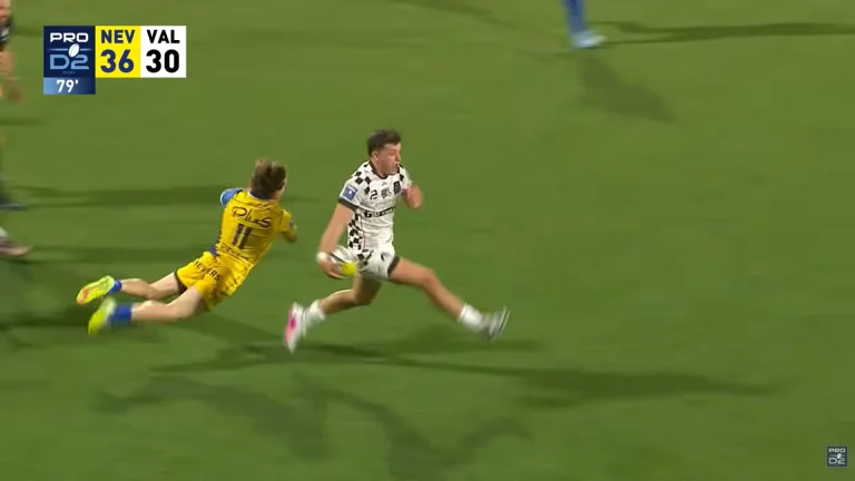 À l’occasion de la 27e journée de Pro D2, Nevers recevait Valence-Romans dans son stade du Pré-Fleuri. Tandis que les visiteurs mènent au retour des vestiaires (8-23), ce sont les locaux qui reprennent l’avantage pour virer en tête à la 76e minute (36-23). Ces derniers se disent qu’ils vont vivre une fin de match assez sereine. Mais ce n’est visiblement pas le projet que Valence a en tête. En effet, Neiceru marque un essai pour les Drômois à quatre minutes du terme. 36-30. Vous l’avez compris, avec encore quelques minutes à jouer, Valence peut encore espérer l’emporter.