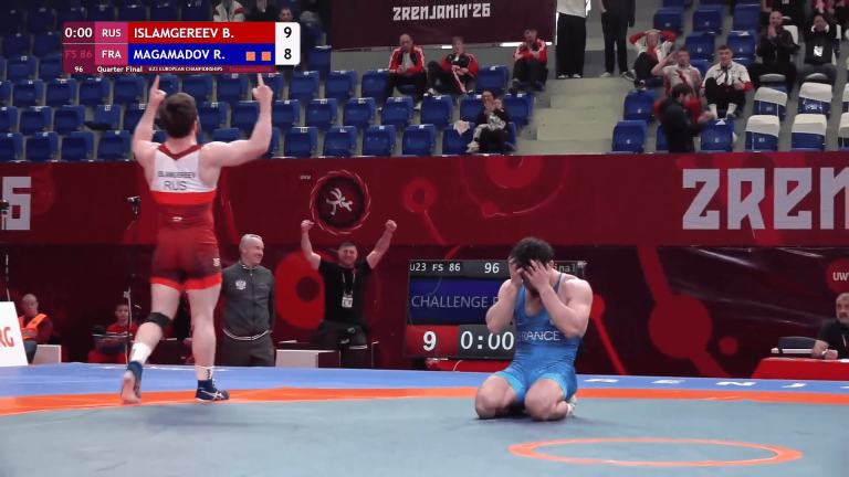 Dans le cadre des quarts de finale des Championnats d’Europe U23 de lutte, un duel a fait de l’ombre aux autres. En effet, le combat entre le lutteur russe Bozigit Islamgereev et le Français Rakhim Magamadov devait logiquement déboucher sur une victoire du second. Celui-ci menait 8-5 à 7,3 secondes du terme, autant vous dire qu’il n’avait plus qu’à assurer pour rallier les demies.