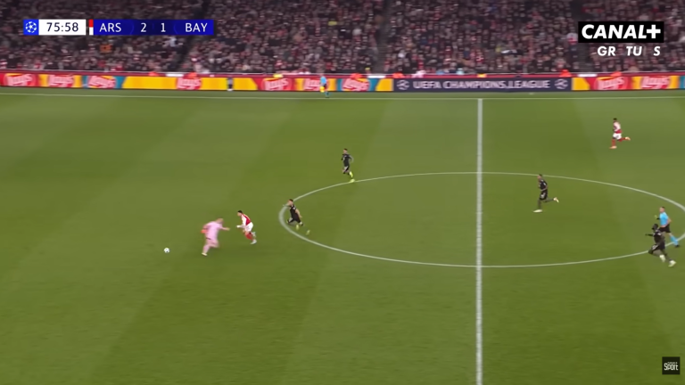 À l’occasion de la cinquième journée de Ligue des Champions, le Bayern Munich se déplaçait sur la pelouse d’Arsenal, l’une de ses victimes favorites ces dernières années en Coupe d’Europe. Mais cette semaine, les Allemands n’ont pas été aussi impériaux que précédemment. Pour preuve, à un quart d’heure du terme, ces derniers sont menés 2-1 à l’Emirates Stadium. Tandis que les Bavarois enchaînent les assauts sur la cage londonienne, les Gunners tentent une contre-attaque en lançant en profondeur Gabriel Martinelli. Le début d’un grand moment de football.
