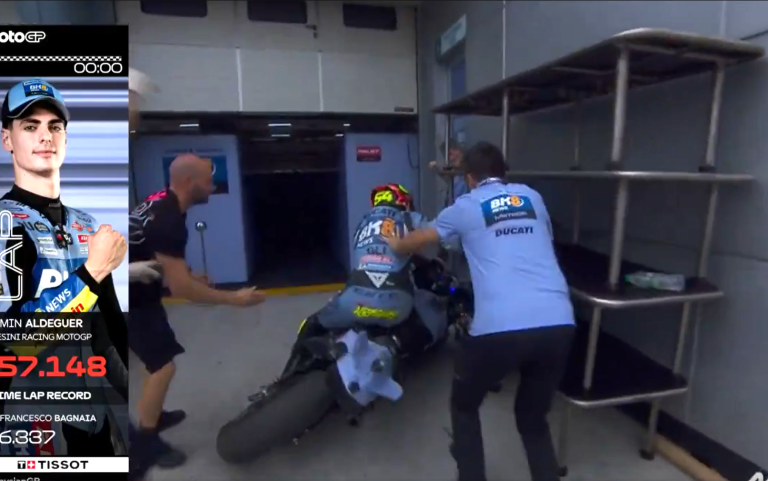 Ce week-end, la Moto GP fait escale en Malaisie. Et alors que Pecco Bagnaia a signé la pole position, et remporté la course sprint, les qualifications ont vu Fermin Aldeguer en délicatesse avec sa bécane. En effet, le pilote espagnol subit une chute en Q1, et se précipite vers son garage. Mais en rentrant, Fermin souhaite perdre le moins de temps possible, alors il se rue à toute vitesse dans son stand, mais fait tomber une seconde fois sa moto. Le tout sous le regard dépité de ses mécaniciens.