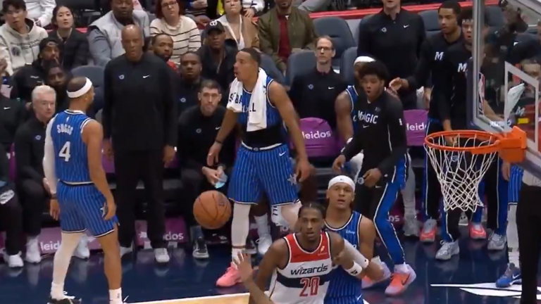 Les Orlando Magic affrontaient les Washington Wizards dans la nuit de samedi à dimanche. Et il faut dire que les Floridiens n’ont laissé aucune chance aux joueurs de la capitale américaine. Un large succès 125-94 acquis sur le parquet des Wizards, 31 points d’écart devant un public pour le moins médusé. Mais contrairement à ce que vous pouvez croire, ce n’est pas le score final qui a été le moment le plus important de cette rencontre. En effet, pour trouver trace du main event de cette partie, il faut s’attarder quelques secondes sur le shoot longue distance de Jalen Suggs. En effet, au moment où l’arrière américain de 24 ans lâche le ballon, il regarde directement le banc, certain de lui sur la destinée de son shoot. Mais ce qui devait arriver arriva ; le ballon rebondit sur le cerceau du panier, et ressort finalement. Célébrer un tir raté, l’inspiration géniale de Jalen Suggs.