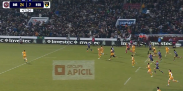 C’est le choc de cette 6e journée de Top 14. En effet, le Stade toulousain reçoit l’Union Bordeaux Bègles pour un remake de la dernière finale. Et il faut bien avouer que les Toulousains n’ont pas laissé le moindre espoir à l’UBB dans cette rencontre. En une seule période, les locaux infligent cinq essais à leurs visiteurs, on ne peut pas dire que l’hospitalité ait été au rendez-vous. Et ce cinquième essai est sans doute le plus dévastateur de tous. Profitant d’un intervalle immense laissé par la défense bordelaise, rendant ainsi un vibrant hommage à celle des Girondins, Ange Capuozzo se faufile entre les défenseurs et file à l’essai. Comme dans du beurre. On ne peut que féliciter la soirée portes ouvertes des joueurs de l’UBB.