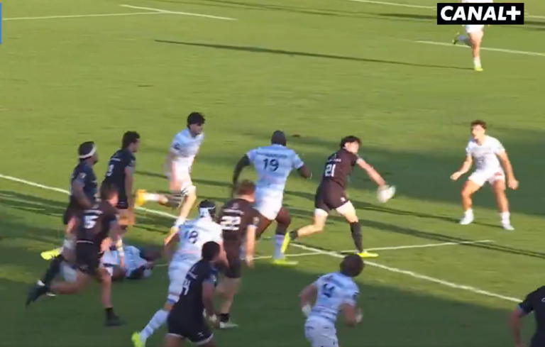Dans le cadre de la sixième journée de Top 14, le Racing 92 recevait Montpellier. Alors qu’on joue l’heure de jeu, et que les locaux mènent 27-13, le MHR porte une attaque. Puis le ballon arrive dans les mains de Hugo Reus, entré cinq minutes plus tôt. Voyant un intervalle, le demi d’ouverture héraultais s’y engouffre, avant de distiller une chistera en direction de Lenni Nouchi, pour le deuxième essai de Montpellier. Mais comme vous pouvez le voir, ce n’est pas l’essai, même réceptionné à une main, qui provoque le plus notre colère.