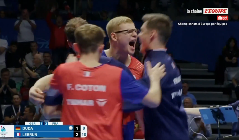 Félix Lebrun termine le travail face à sa bête noire Benedikt Duda, et permet à l’équipe de France de se qualifier pour la finale des Championnats d’Europe par équipes. La sixième de son histoire, soit exactement la sixième de trop.