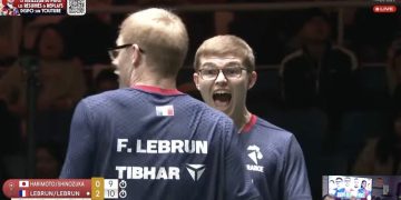 Les frères Lebrun remettaient leur titre de champions de France du double hommes face à la paire Florian Bourrassaud – Esteban Dorr. Et le premier point de la partie est à mettre à l’actif de ces derniers. Une once d’espoir brille dans nos yeux, avant de se rendre compte que les frangins de Montpellier remportent le premier set sur le score de 11-4. Puis dans la deuxième manche, c’est un voyage en dehors du temps que nous vous proposons. Les frères Lebrun perdent les dix premiers points pour se retrouver menés 10-0. Oui, DIX À ZÉRO. On est où là ? Après une remontadita à 10-2, c’est bien le duo Bourrassaud – Dorr qui s’impose 11-2. Une manche partout, tout est à refaire.