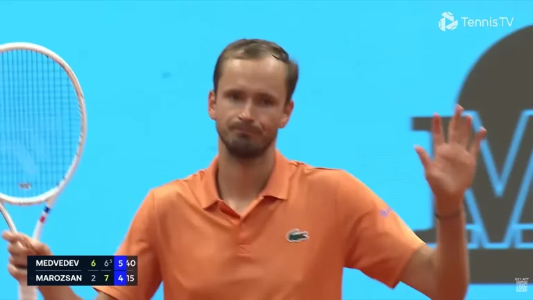Opposé à Fabian Marozsan en 32es de finale du Masters 1000 de Madrid, Daniil Medvedev a dû batailler face au joueur hongrois. En effet, le Russe a été amené dans un troisième set irrespirable. Avant de basculer dans un nouveau tie-break, le dixième joueur mondial se procure une balle de match sur le service de son adversaire. Au terme d’un long échange, Medvedev tente un passing croisé en voyant la montée au filet de Marozsan.